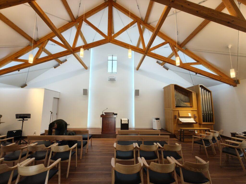 既存の教会が老朽化して建て替えることから、新築の依頼となりました。完成したのは2024年8月。それから1年半くらい経っているので、実際の居心地や使い勝手についても聞くことができました。