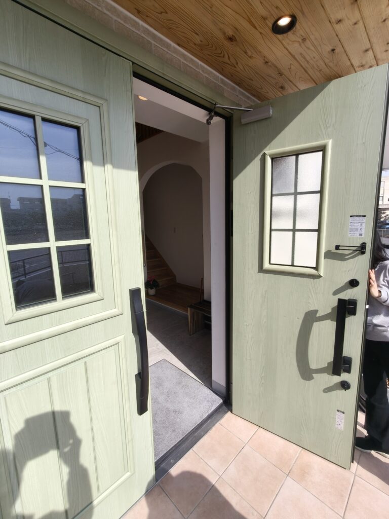 ドアは高断熱仕様になっていますが、高性能の建物には珍しい両開きドアです。これは、教会なので棺が通れる幅が必要だからだそうです。