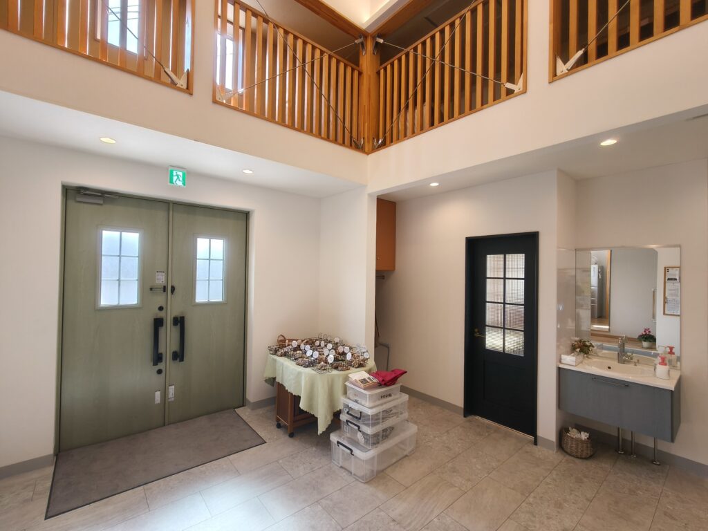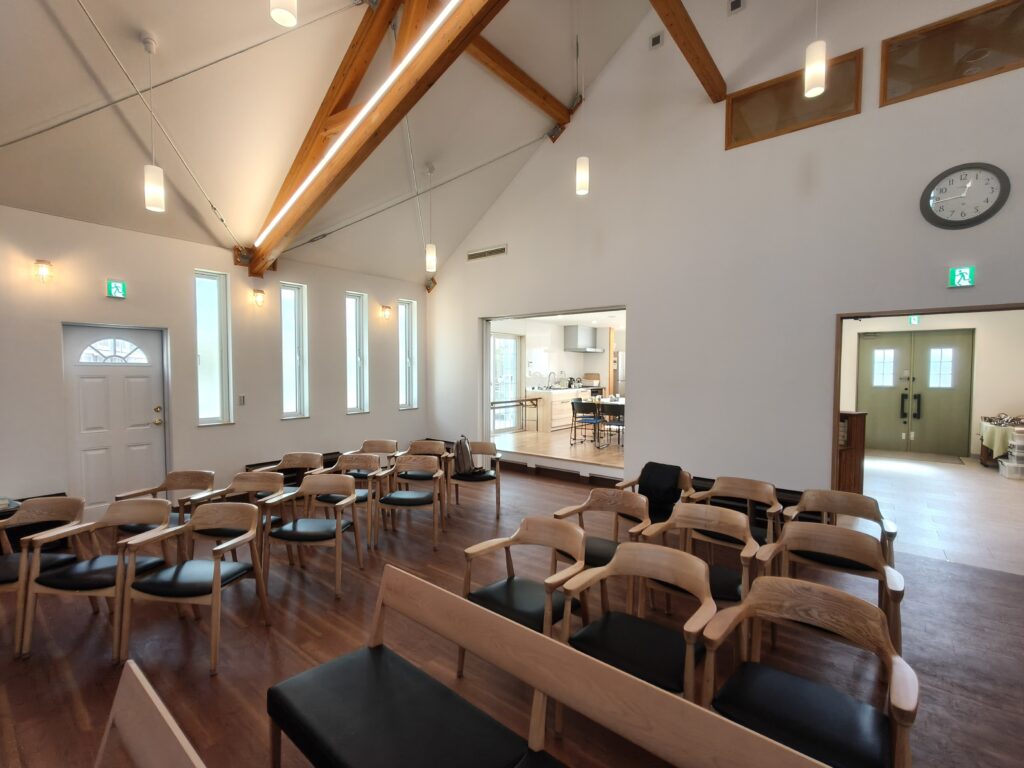 建物は、玄関ホール、礼拝堂、多目的室、事務室のような部屋が2つあります。建物の面積は、小屋裏も合わせて230平方メートルと、比較的コンパクトな教会です。
